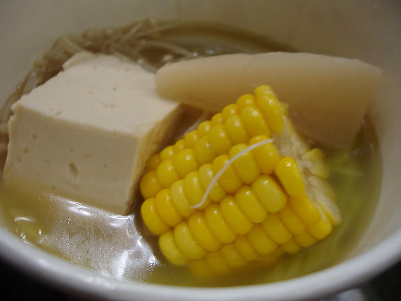 鮮蝦肉福袋,裡面有冬粉及蝦仁一隻,味道soso,雪魚豆腐(較一般豆腐有口感)蘿蔔及玉米不夠甜....,有點小失望。
