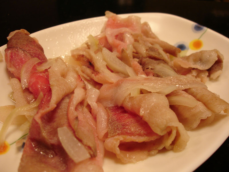 石頭火鍋炒過的五花豬肉,加洋蔥炒過更香,半熟的狀態,要吃再加入火鍋中煮。