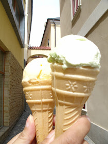 小店買的冰淇淋,李先生很勇敢的買了綠色的杏仁口味............黃色的是香草口味,都偏甜。