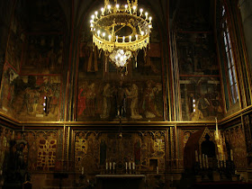 教堂內2旁的玫瑰窗,玻璃鑲嵌的完教故事與彩繪玻璃展示中世紀的精巧工藝。其中一座是由捷克藝術家慕夏所創作,風格柔美華麗。