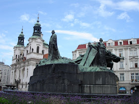 廣場中央胡斯雕塑,古斯堅持宗教改革而被處死,並引發了捷克歷史上的第一次人民全面性反抗,這座雕像於胡斯被處死後500年的1915年7月6日建立,取代原來廣場上的哈布斯王朝紀念柱,雕像的四周是廣場上的免費座位。
