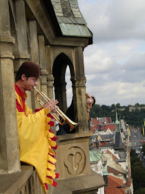 天文鐘整點敲動時鐘後,塔頂的人員會在四面吹響喇叭報時