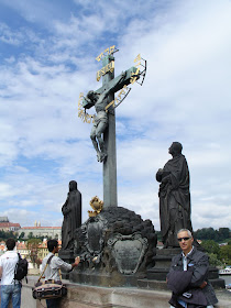 被針在十字架上的耶穌雕塑,這是橋上最古老的雕像之一,原造於1361年,後來胡斯戰爭被毀壞,1629年又裝上一個木造的十字架,可惜在瑞士運團入侵時又遭破壞,1657年終於架上金屬的十字架,然後2旁又增加了聖母瑪麗亞與祈禱者約翰。