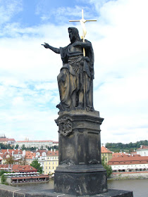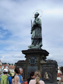 聖•內波穆克雕塑。被扔下橋下的聖人橋上最受歡迎的雕塑,把手輕觸下方的青銅版畫可以讓你願望實現。