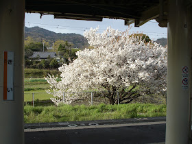 回程車站陽光下滿開的吉野櫻
