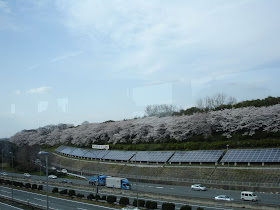 車站往萬博公園望去,外圍一整片櫻花及太陽能板。