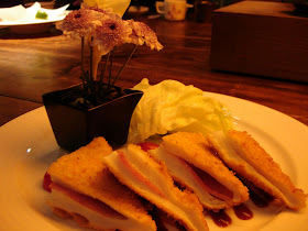 起司鱈魚排:鱈魚魚漿包裏起司以及火腿,表皮炸的酥脆,魚漿濃濃的魚香味,生菜包裏後一起入口,這魚漿好吃。