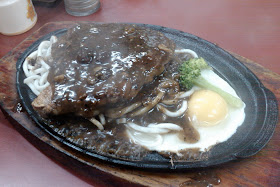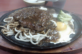 厚片牛排(130元)熱呼呼的鐵板,香噴噴的冒著煙,黑楜椒醬對我有莫名的吸引力。