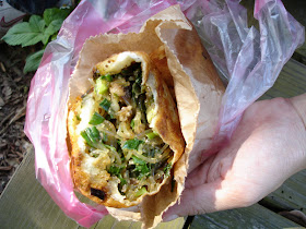 在仁愛米糕點菜的過程,李小胖跑去買了王記煎包外帶到通霄神社當飯後點心,皮薄內餡滿滿韮菜及冬粉,不錯吃,但是油了點。