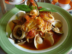 茄汁海鮮義大利麵,滿滿新鮮的海鮮料,真是太划算了,茄汁醬帶淡淡白酒香,好吃。