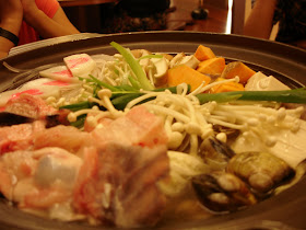鮮魚火鍋,打包回家 和風鮑魚,上面的沙拉醬不要,會更適合。