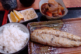 青花魚定食(200元)青花食超大一份,剛烤好配飯吃真過癮,配菜:牛蒡以及濃濃日本味的馬鈴薯燉肉。