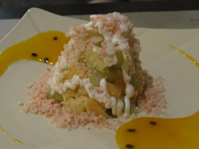 海鮮沙拉:新鮮水果灑上切細的蟹腳肉淋上沙拉及百香果醬,清爽不錯吃。