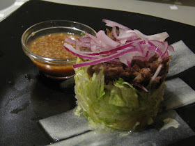 碧綠牛肉沙拉:帶筋的牛肉淡淡的魯汁香味,淋上酸甜和風醬,有點中日和併的清爽感。鋪底的黃瓜片酸甜的也很好吃。