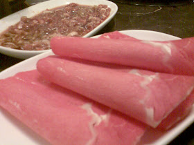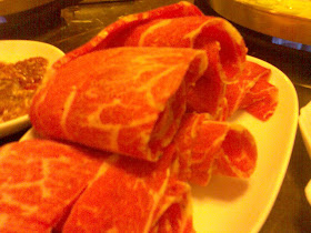 我點的主鍋沙朗牛肉(220元), 旁邊是同事點的韓式銅板烤羊肉, 沙朗牛肉入鍋涮個二三下,就是粉嫩好吃的讚。