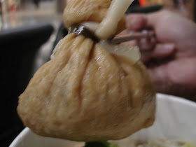 鮮蝦肉福袋,裡面有冬粉及蝦仁一隻,味道soso,雪魚豆腐(較一般豆腐有口感)蘿蔔及玉米不夠甜....,有點小失望。