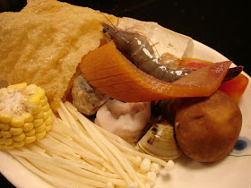 菜盤:很少看到火鍋有附魷魚,每道都吃的出店家的用心,青菜除了鍋內的高麗菜還會會另外給大陸妹、玉米甜,貢丸會爆醬、米血是手工的、蝦子也很新鮮,醬料則是特製的沙茶醬。