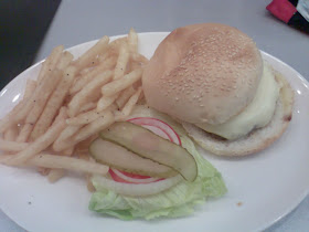 起司牛肉堡(160元)配菜自行組裝夾入漢堡,牛肉算實在,但要加些黃芥茉才好吃。